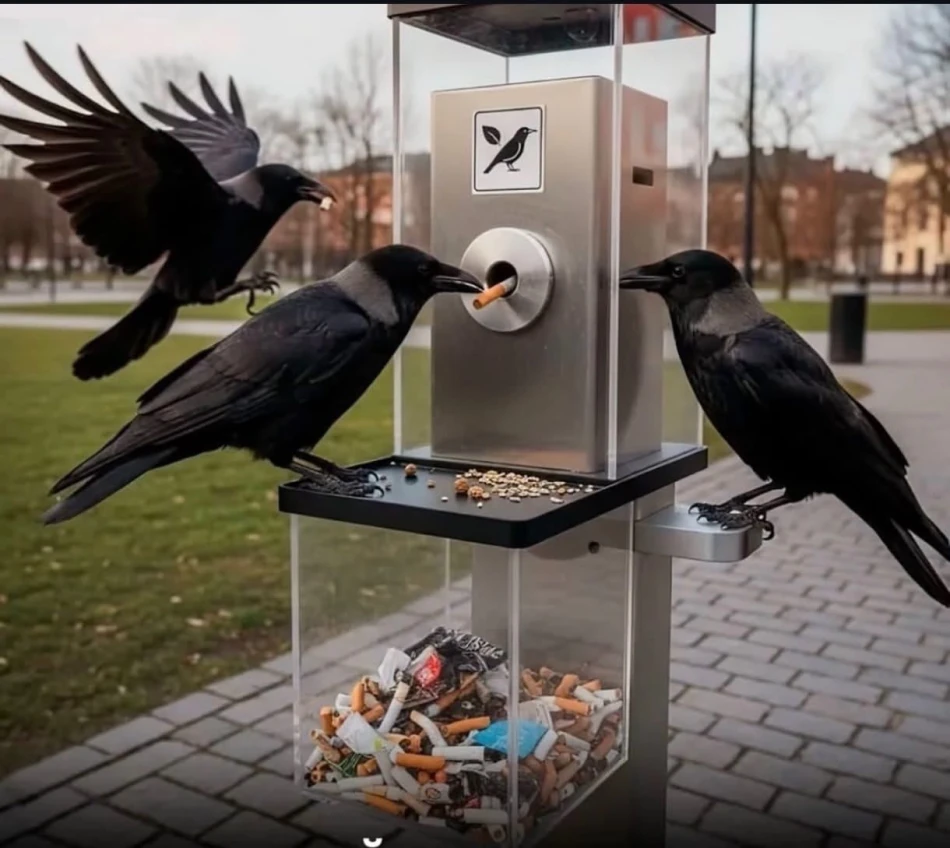 Վայրի ագռավներին սովորեցնում են փողոցներում նետված ծխախոտի մնացորդները հավաքել և գցել հատուկ սարքերի մեջ՝ դրա դիմաց ստանալով փոքրիկ սնունդ։ Նախագիծը իրականացնում է Corvid Cleaning ստարտափը, և թռչունները մասնակցում են կամավոր։